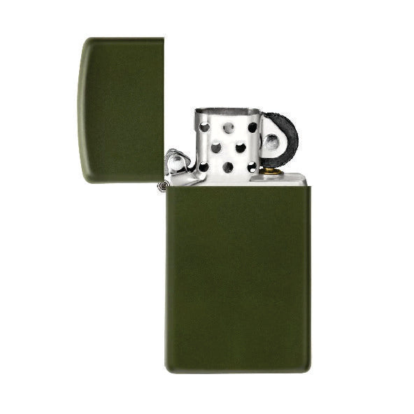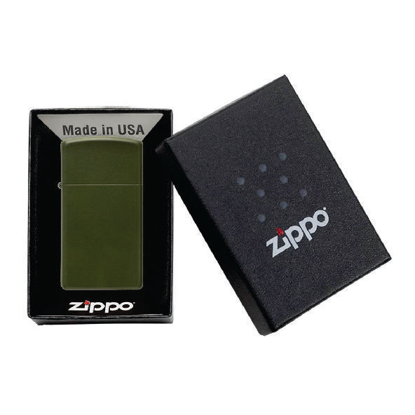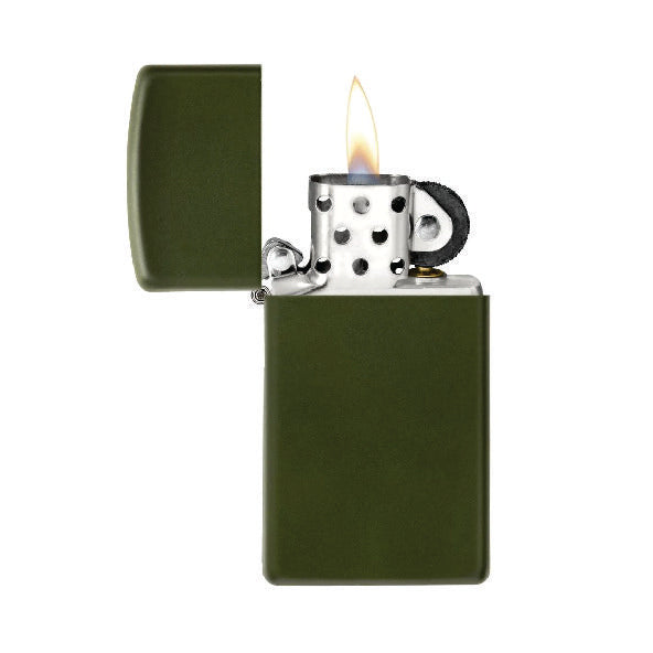 Una versión más pequeña de nuestro clásico encendedor a prueba de viento. Este encendedor verde mate Slim® es fácil de guardar en su bolsillo, bolso o bolso. Este encendedor también está disponible en un estuche Classic . Viene empaquetado en una caja de regalo. Para un rendimiento óptimo, llene con combustible para encendedor Zippo .