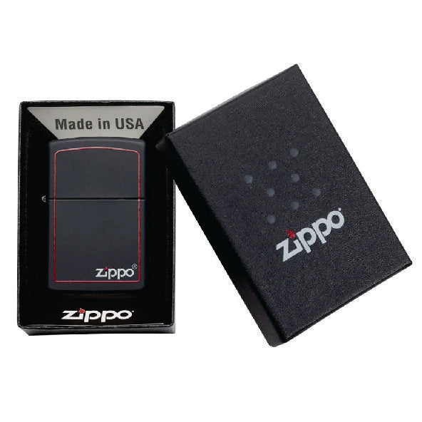 Este mechero negro mate a prueba de viento con borde rojo está adornado con el logotipo clásico de Zippo. Este encendedor también está disponible en un estuche Slim® . Viene empaquetado en una caja de regalo. Para un rendimiento óptimo, llene con combustible para encendedor Zippo .