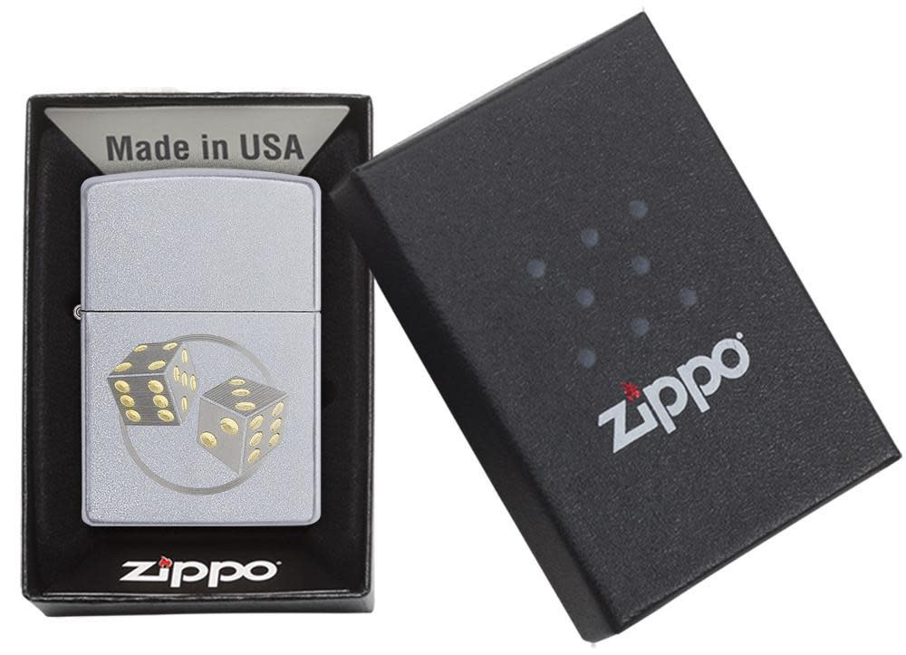 Este exclusivo encendedor grabado ha creado un llamativo aspecto de dos dados. El diseño automático de dos tonos en un encendedor Satin Chrome™ es sin duda una apariencia atractiva a un precio atractivo. Viene empaquetado en una caja de regalo. Para un rendimiento óptimo, rellene con combustible para encendedores Zippo.