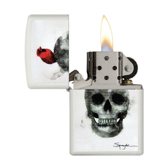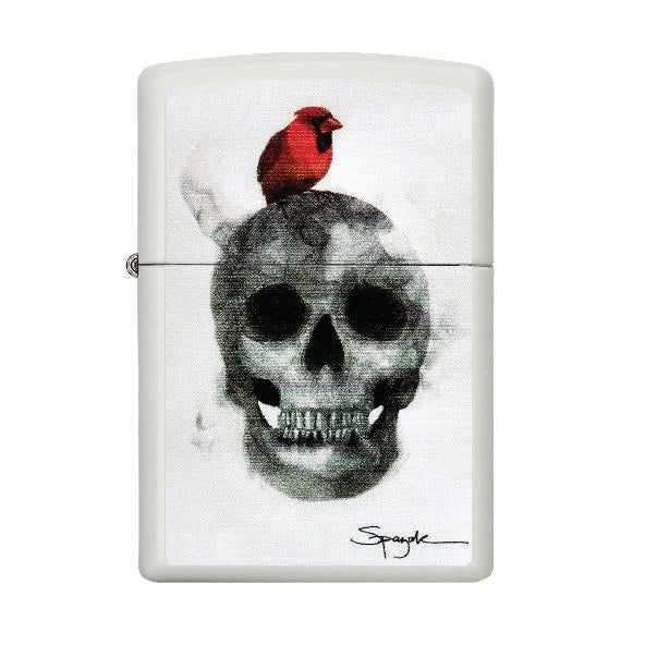 El dueño de un encendedor Zippo desde hace mucho tiempo,  Steven Spazuk,  es un artista canadiense que se especializa en la "técnica del fumage", utilizando el fuego para crear dibujos hiperrealistas pero de ensueño. Este año, Zippo se asoció con Spazuk para ofrecer varias reproducciones brillantes de sus piezas más notables en la superficie de un encendedor blanco mate a prueba de viento. Este modelo presenta un hermoso cardenal descansando sobre una calavera humeante. Viene empaquetado en una caja de regalo. Para un rendimiento óptimo, llene con combustible para encendedor Zippo .
