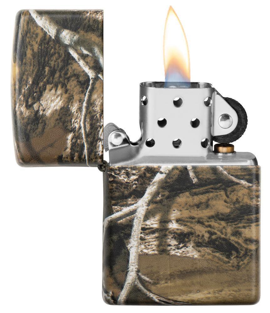 Mézclate con este encendedor de camuflaje envuelto Realtree® Edge. La piel de camuflaje envuelve completamente la carcasa del encendedor. La piel de camuflaje varía con cada diseño más claro, haciendo que cada uno sea único. Viene empaquetado en una caja de regalo. Para un rendimiento óptimo, llénelo con combustible para encendedor Zippo.
