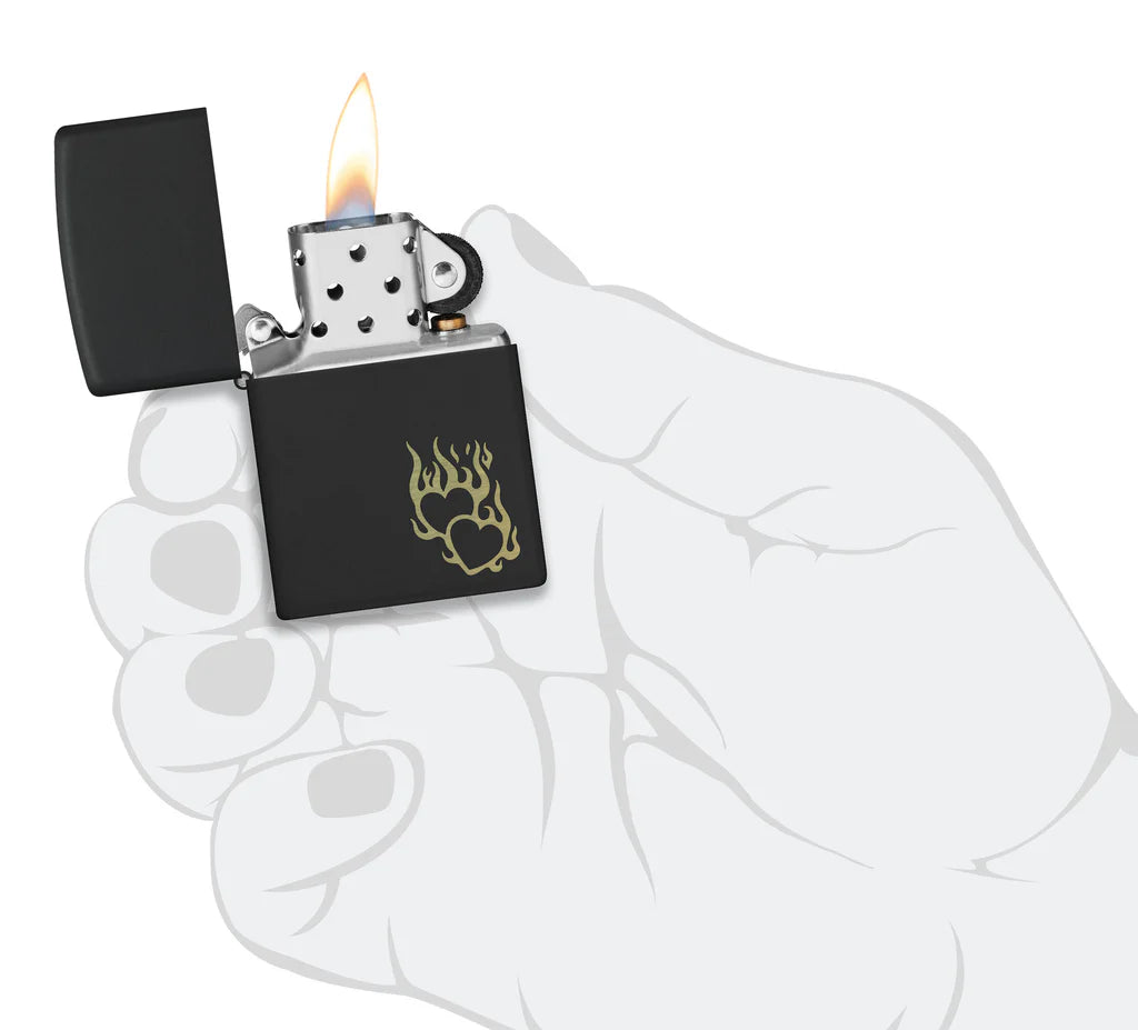 Demuestra tu ardiente amor con este clásico encendedor negro mate. Un par de corazones en llamas se encuentran en la superficie del encendedor con un ardiente diseño grabado con láser. Viene empaquetado en una caja de regalo. Para un rendimiento óptimo, llénelo con combustible para encendedor Zippo.