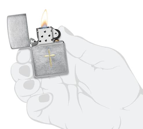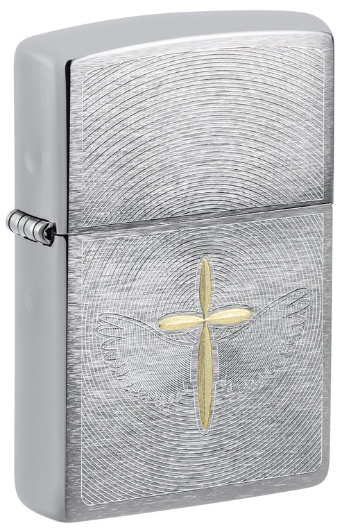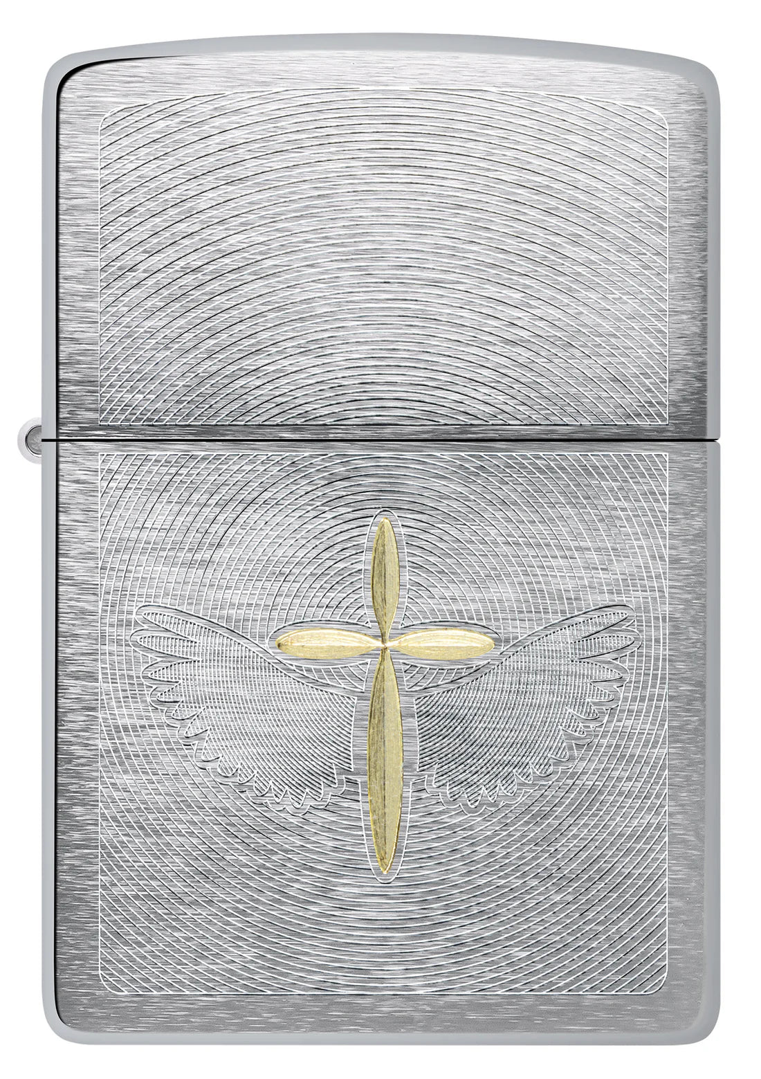 Un aura delicada y precisa y alas de ángel rodean una cruz de latón brillante en este encendedor clásico de cromo cepillado con un diseño automático de dos tonos. Viene empaquetado en una caja de regalo. Para un rendimiento óptimo, rellénelo con combustible para encendedores Zippo.