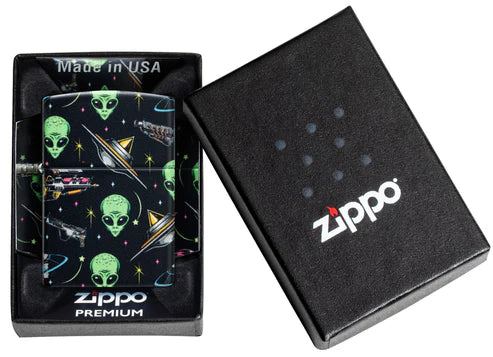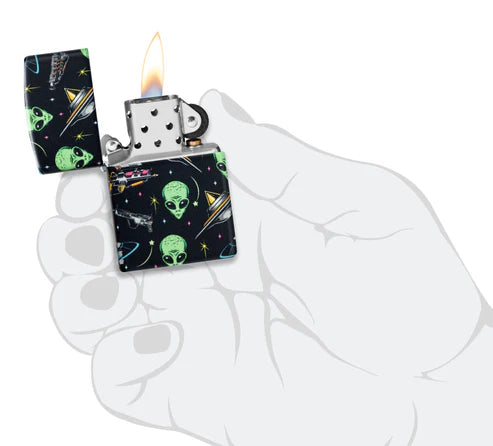 Un motivo sobrenatural de extraterrestres y naves espaciales rodea cada superficie de este clásico encendedor 540 Color. Viene en una caja de regalo. Para un rendimiento óptimo, llénelo con gasolina para encendedores Zippo.