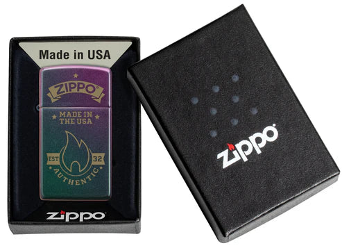 Este encendedor Slim® Iridiscente presenta un diseño clásico de Zippo grabado a láser , que revela llamativos tonos latón bajo su fascinante acabado. Se presenta en una caja de regalo. Para un rendimiento óptimo, llénelo con combustible para encendedores Zippo.