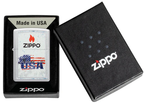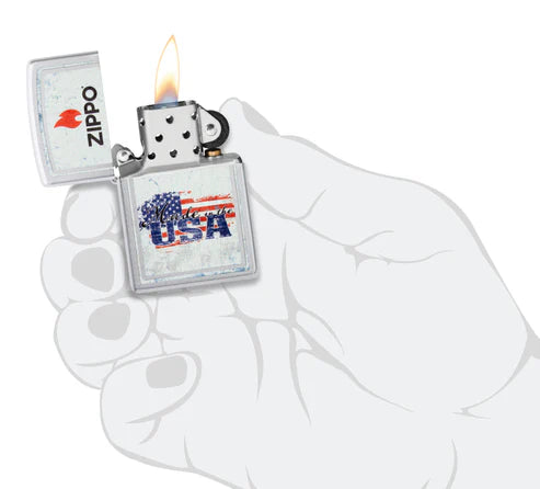 Tan estadounidense como el pastel de manzana, este clásico encendedor de cromo satinado es un grito de patriotismo. El logotipo de Zippo corona la tapa, mientras que la inscripción "Hecho en EE. UU." define el diseño de la imagen a color. Viene en una caja de regalo. Para un rendimiento óptimo, llénelo con combustible para encendedores Zippo.