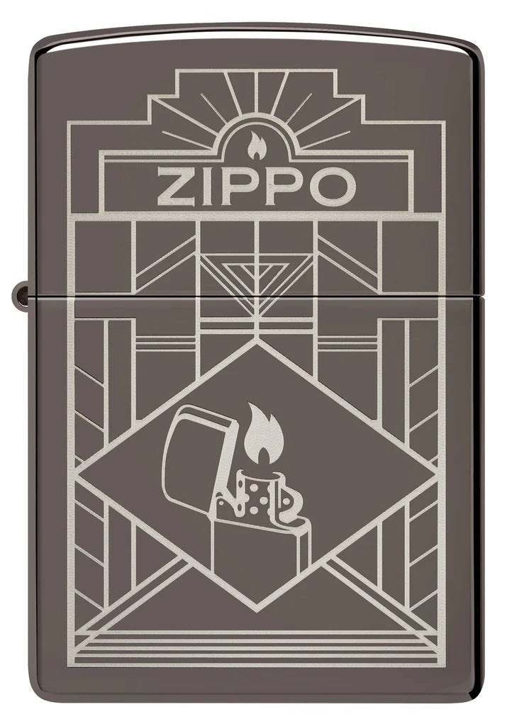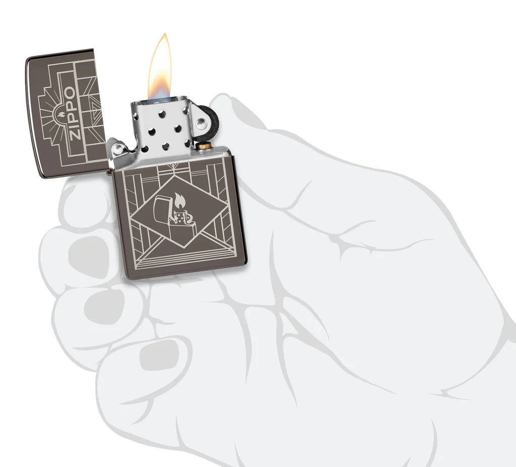 El diseño de lujo grabado con láser en este encendedor Black Ice ® presenta el logotipo de Zippo encima de un dibujo de estilo Art Deco, mientras que una imagen reducida de un encendedor arde con una llama que realmente nunca se apagará. Viene empaquetado en una caja de regalo. Para un rendimiento óptimo, llénelo con combustible para encendedor Zippo.