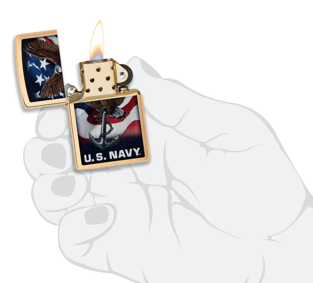 Anclado en la marca denominativa US Navy ® , este encendedor patriótico de latón cepillado presenta el icónico águila y el ancla sobre una bandera estadounidense ondeante en un diseño atemporal de imagen en color. Viene empaquetado en una caja de regalo. Para un rendimiento óptimo, llénelo con combustible para encendedor Zippo.