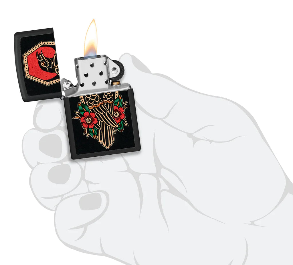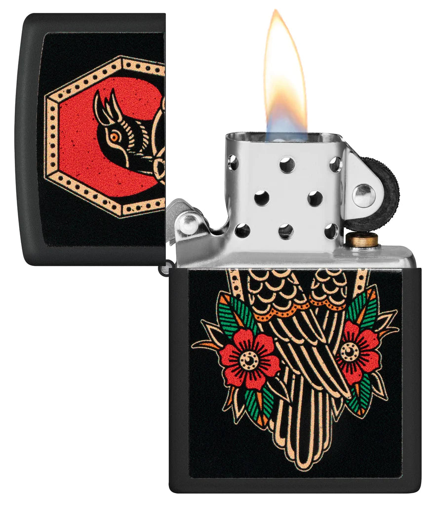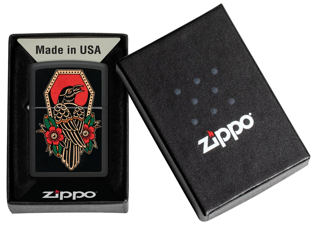 Simbolizando la sabiduría y la previsión, un cuervo negro azabache anida entre audaces flores en este encendedor negro mate con un diseño de imagen en color tradicional inspirado en un tatuaje. Viene empaquetado en una caja de regalo. Para un rendimiento óptimo, rellene con combustible para encendedores Zippo.