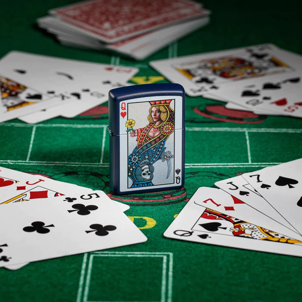 Reinas opuestas se yuxtaponen majestuosamente en este encendedor Navy Matte. El diseño de la imagen en color muestra a las monarcas en duelo en un yin-yang inspirado en las cartas de juego. Viene empaquetado en una caja de regalo. Para un rendimiento óptimo, llénelo con combustible para encendedores Zippo.