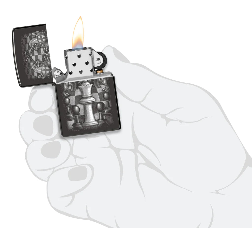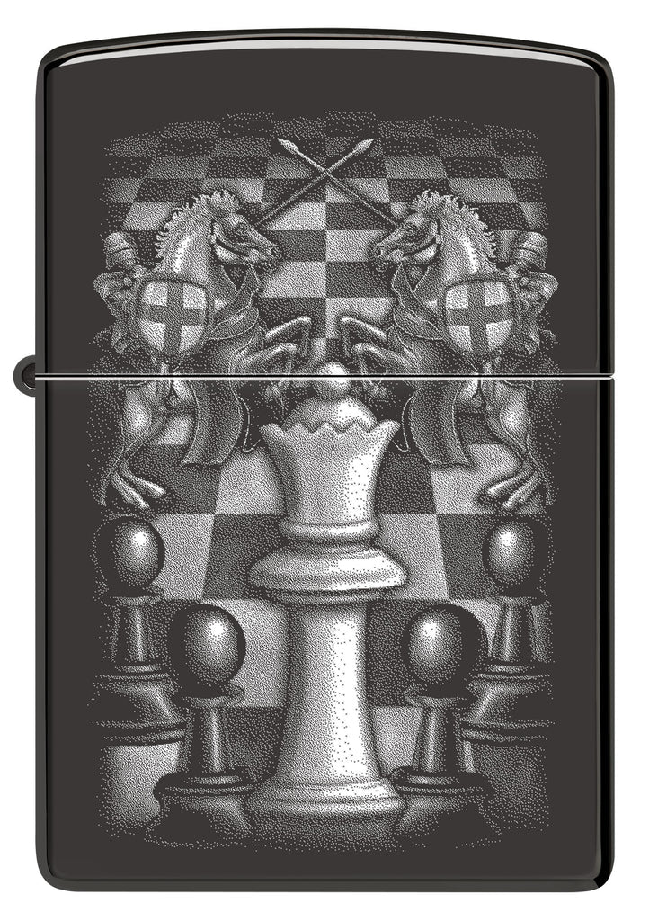 Flanqueada por sus caballeros de confianza, la Reina domina el tablero de ajedrez en este clásico encendedor negro de alto pulido con un majestuoso diseño Color Image. Viene empaquetado en una caja de regalo. Para un rendimiento óptimo, llénelo con combustible para encendedor Zippo.