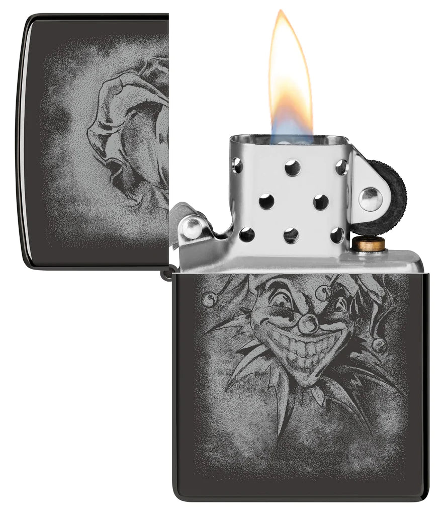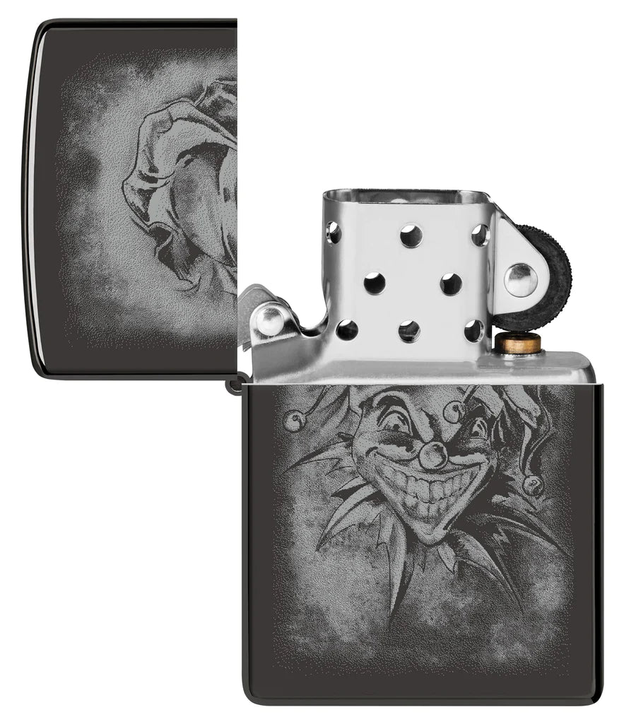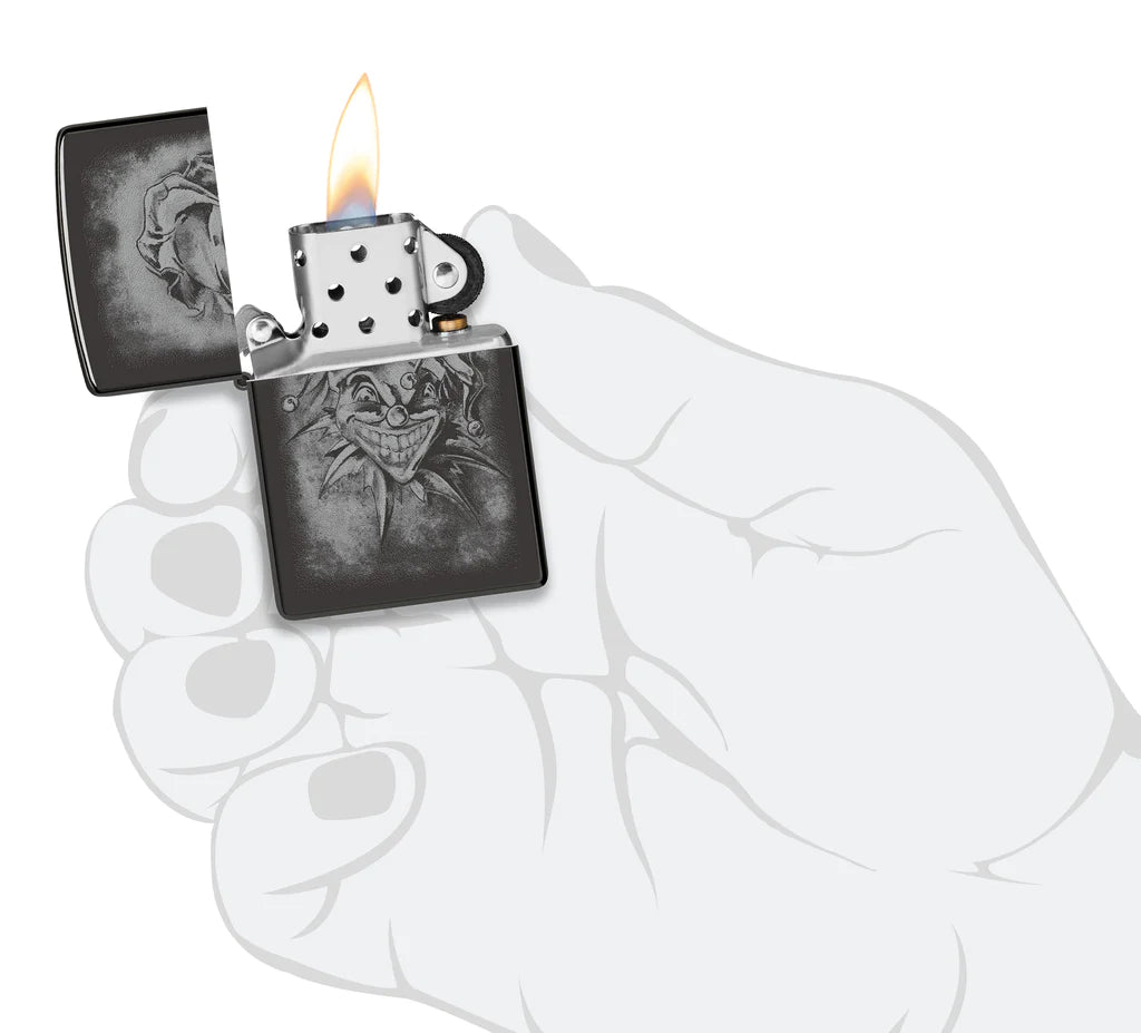 Un payaso diabólico sonríe desde la superficie de este misterioso encendedor negro de alto brillo con un inquietante diseño de imagen fotográfica. Viene empaquetado en una caja de regalo. Para un rendimiento óptimo, llénelo con combustible para encendedor Zippo.