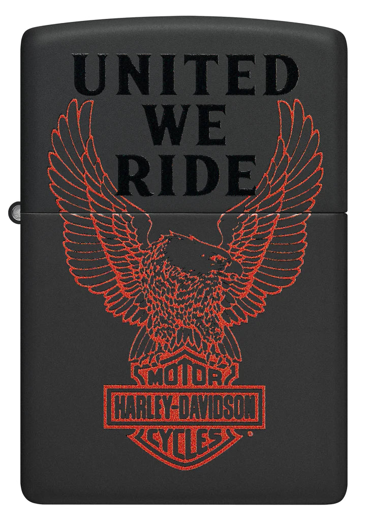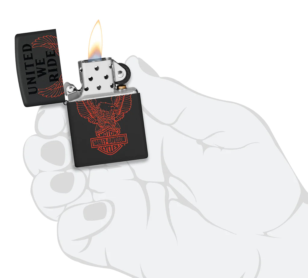 Respaldado por la inscripción "United We Ride", el logotipo del águila Harley-Davidson domina la superficie de este encendedor clásico en negro mate con un feroz diseño Color Image. Viene empaquetado en una caja de regalo. Para un rendimiento óptimo, llénelo con combustible para encendedor Zippo.