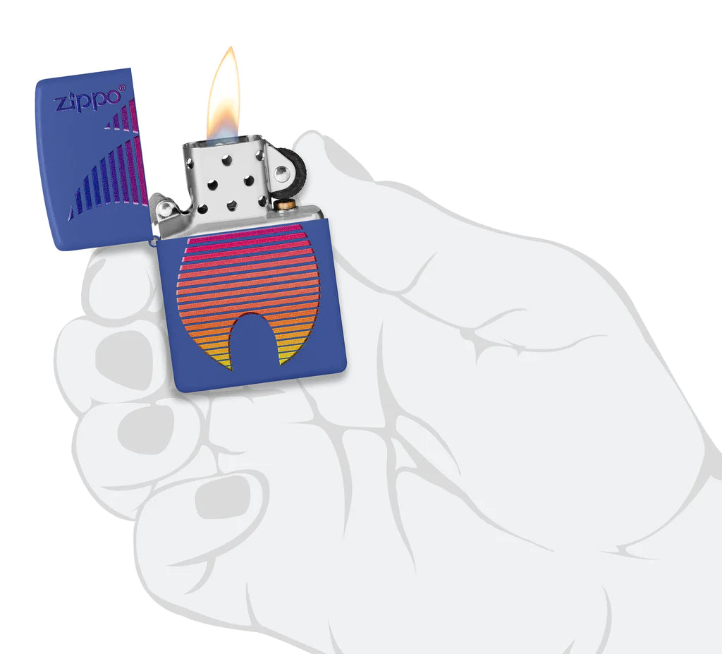 Este atrevido encendedor Royal Blue Matte presenta un ícono de llama Zippo degradado junto al logotipo de Zippo en un diseño de imagen en color vibrante. Viene empaquetado en una caja de regalo. Para un rendimiento óptimo, llénelo con combustible para encendedor Zippo.