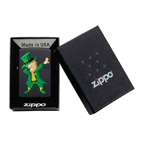 ¿Puedes atrapar al duende dabbing? Este diseño retrata a un clásico duende del folclore irlandés tocando un encendedor negro mate. ¡Atrapa a este pequeño chico de barba roja hoy y obtén su olla de oro escondida! Viene empaquetado en una caja de regalo. Para un rendimiento óptimo, llene con combustible para encendedor Zippo .