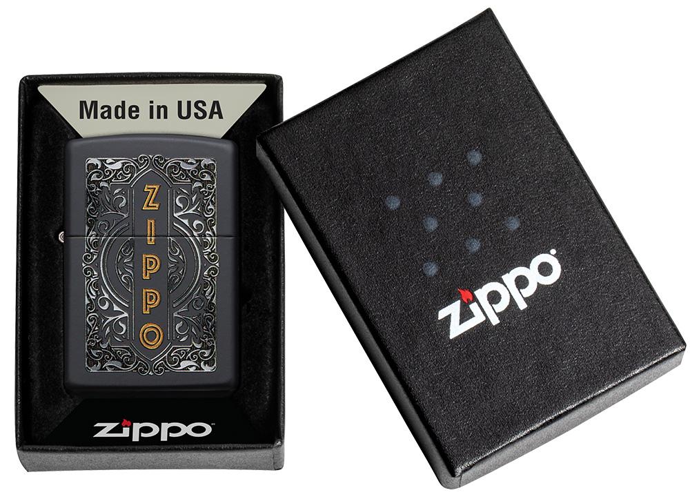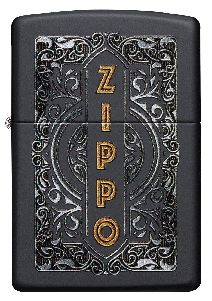 Este Black Matte muestra un elegante diseño inspirado en Zippo. Rodeado por una hermosa filigrana plateada hay un logotipo Zippo vertical de color dorado, que se crea mediante el proceso de imágenes en color. Viene empaquetado en una caja de regalo. Para un rendimiento óptimo, llene con combustible para encendedor Zippo.