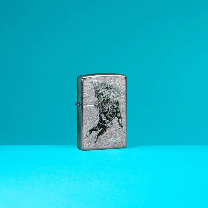 Ahora sabemos por qué nadie ha visto Bigfoot. Rick Rietveld regresa con otro diseño original que se siente como en casa en un encendedor Zippo. Usando nuestro proceso de imagen en color, este encendedor Street Chrome ™ presenta a Sasquatch escapando en un jetpack steampunk personal. Viene empaquetado en una caja de regalo. Para un rendimiento óptimo, rellene con combustible para encendedores Zippo.