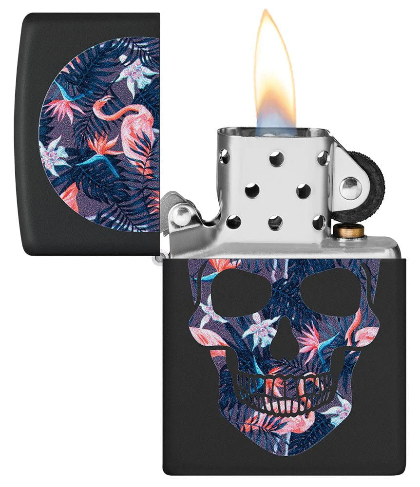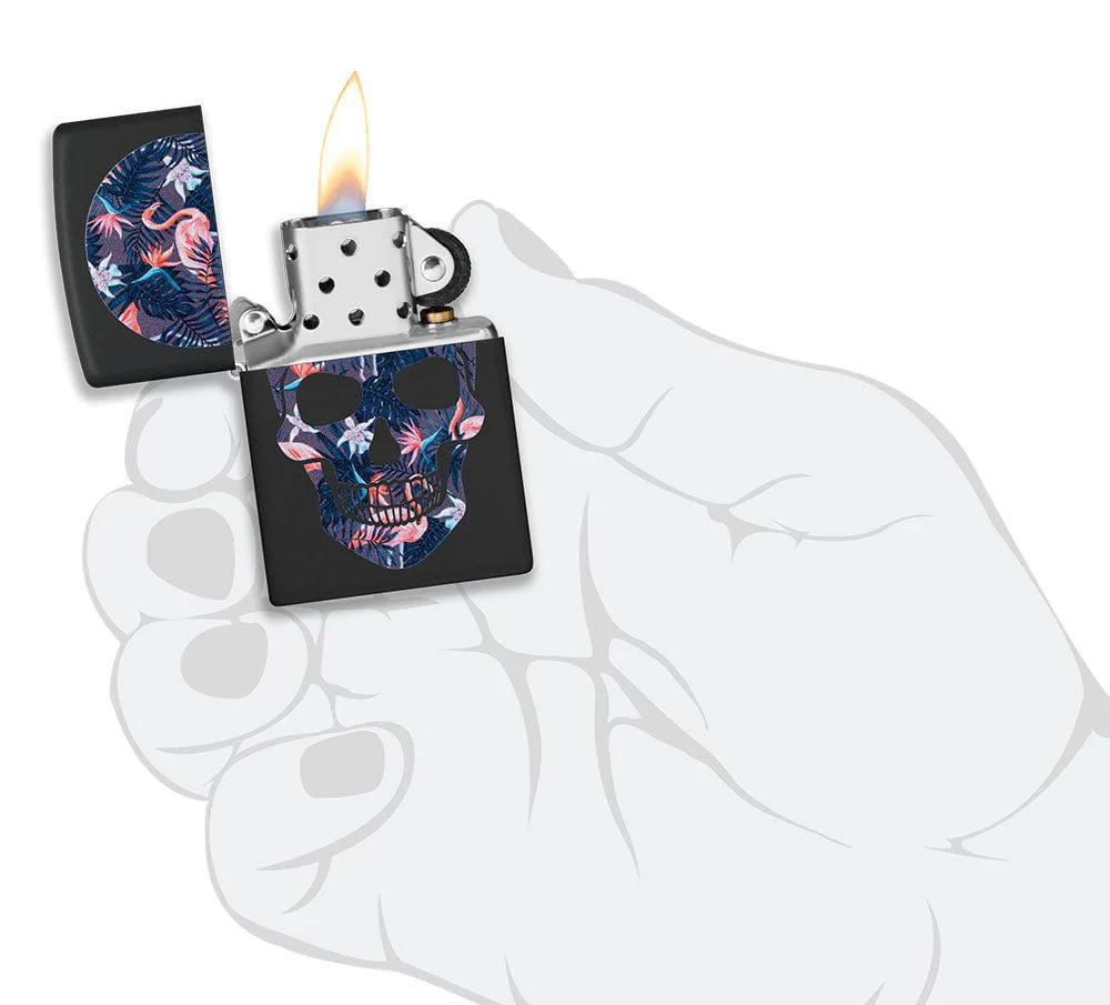 Espeluznante y dulce se unen en este macabro y divertido encendedor Black Matte. Los flamencos y las flores llenan una calavera utilizando nuestro proceso de imagen en color. Viene empaquetado en una caja de regalo. Para un rendimiento óptimo, rellene con combustible para encendedores Zippo.