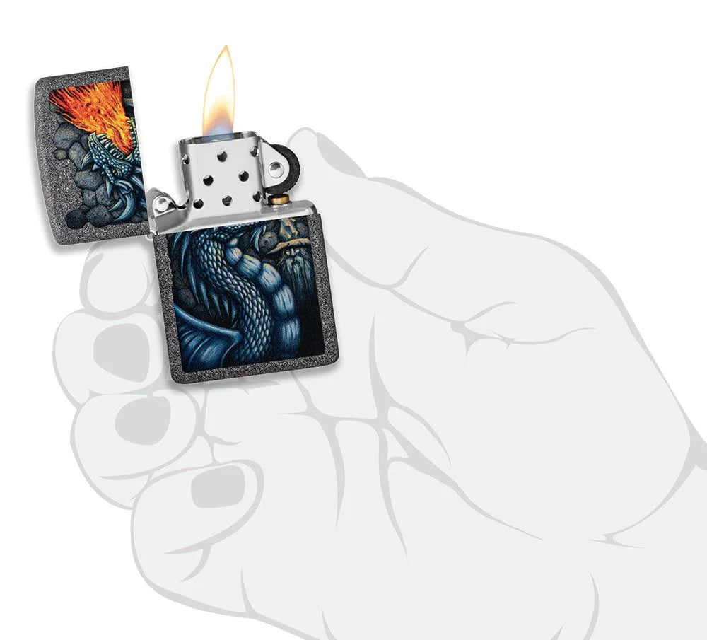 Un símbolo de fuerza y ​​​​poder innegables, un dragón feroz exhala llamas vibrantes en este encendedor de piedra de hierro, que parece saltar de la superficie gracias a nuestro proceso de imagen en color. Viene empaquetado en una caja de regalo. Para un rendimiento óptimo, llene con combustible para encendedores Zippo.
