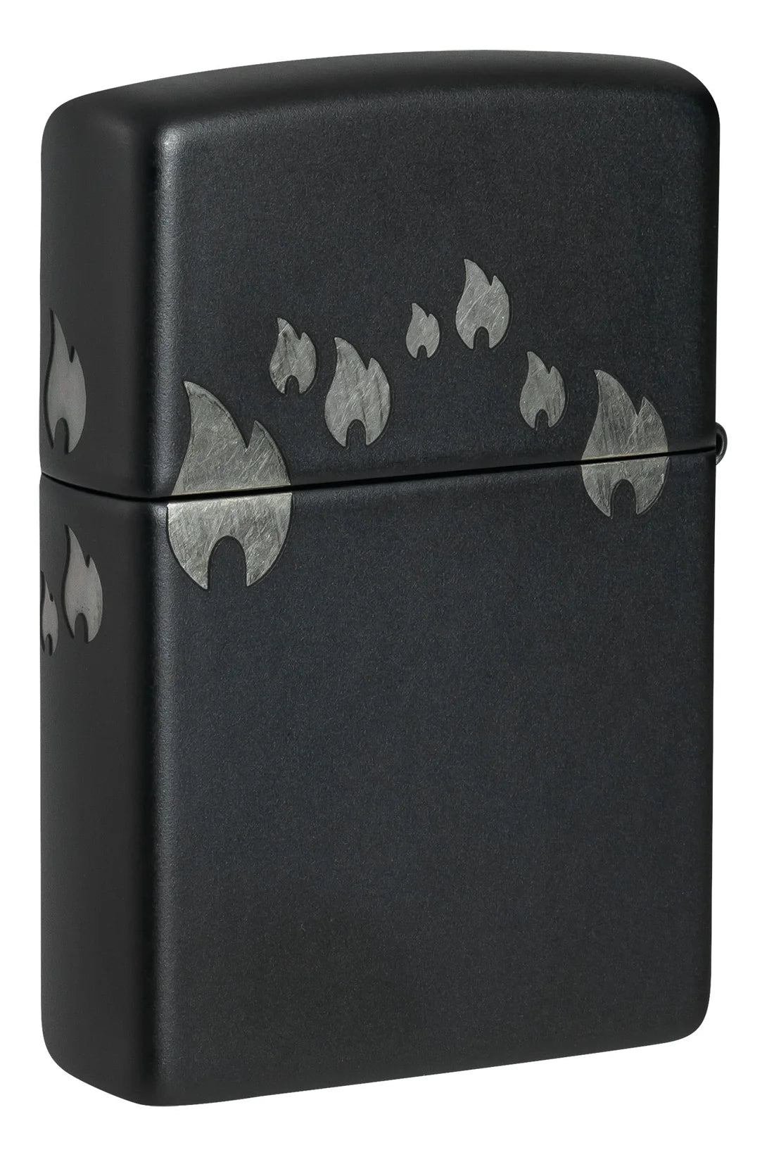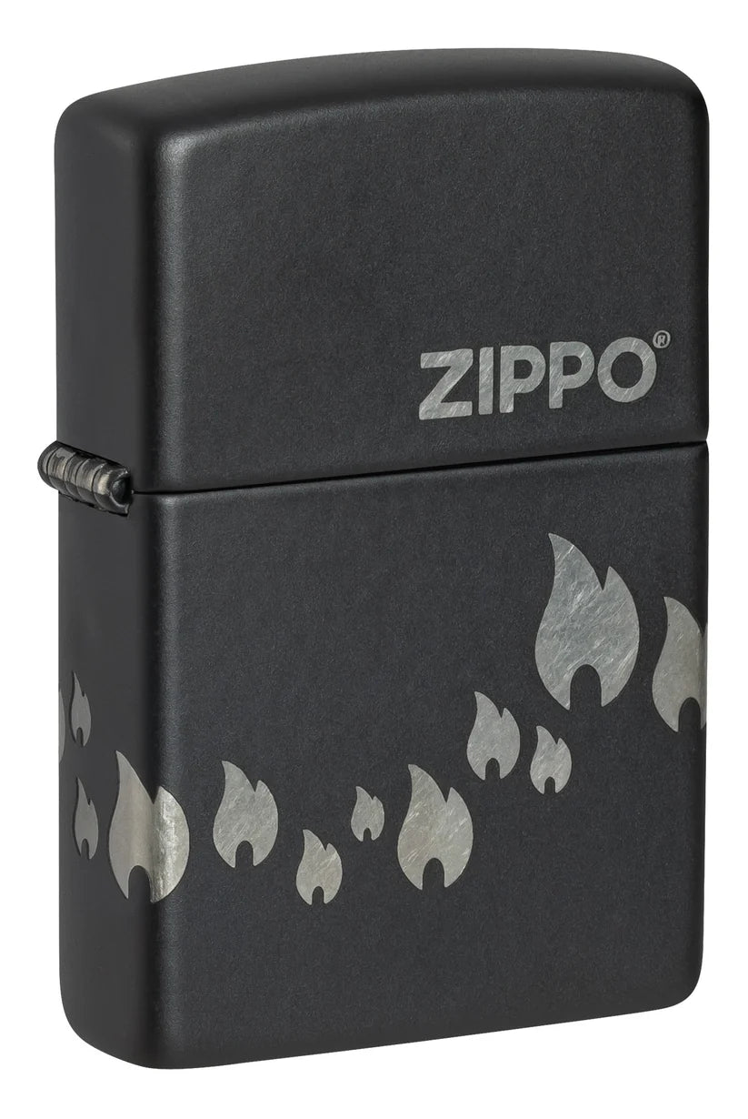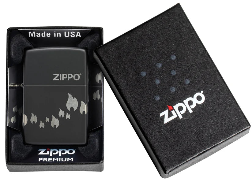 Un desfile de iconos de llamas Zippo baila por todos los lados de este encendedor clásico negro mate con un diseño simple de láser de 360°, que incorpora el logotipo de Zippo en la tapa del encendedor. Viene empaquetado en una caja de regalo. Para un rendimiento óptimo, llénelo con combustible para encendedores Zippo.